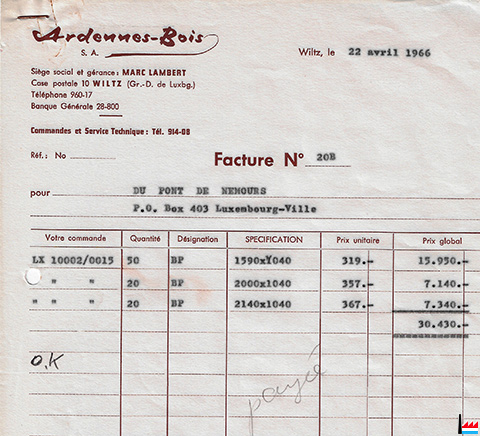 1966 - Ardennes-Bois S.A. - Gérance MARC LAMBERT - Facture pour DU PONT de NEMOURS, S.A. - Wiltz, le 22 avril 1966