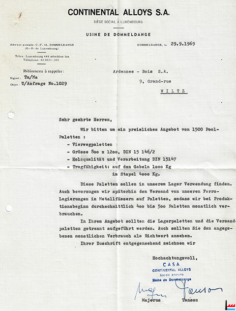 29.9.1969 - CONTINENTAL ALLOYS, S.A. - Usine de Dommeldange. - Demande de prix adressée à la société anonyme Ardennes-Bois, Wiltz, 9, Grand-rue.