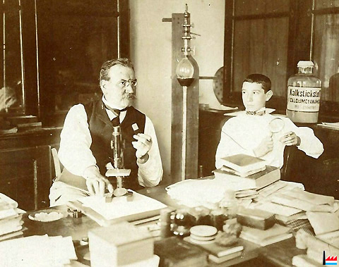 1909 - Le Dr Camille Aschman présente un flacon de Peptone à son fils Camille - Ettelbruck - Collection famille Aschman-Bodson.