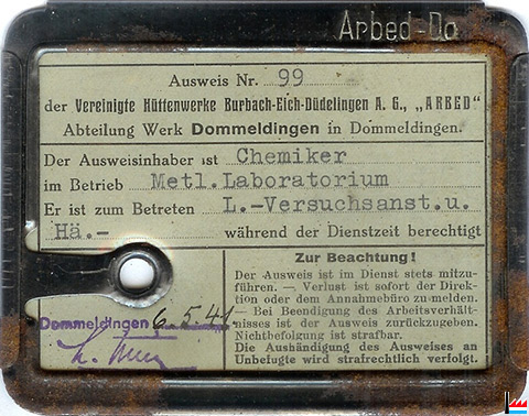 Der Ausweisinhaber ist Chemiker im Betrieb Metl. Laboratorium. Er ist zum Betreten L. - Versuchsanst. u. Hä. - während der Dienstzeit berechtigt. (6. 5.41.)
