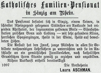 Das Pensionat befindet sich in Sinzig, einem kleinen, in schönster Rheingegend gelegenen Städtchen am Auslaufe des reizenden Ahrthales, der sogenannten goldenen Meile - Eisenbahnstation zwischen Bonn und Coblenz - mit sehr gesundem Klima, herrlichen Spaziergängen, theils in der Ebene, theils auf bewaldeten Höhen. |