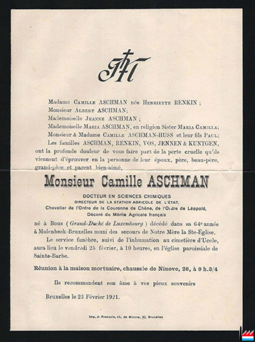 | 23.2.1921 | ![]() Décès de Camille Aschman à Bruxelles. |