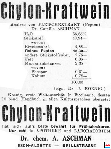 | Décembre 1928 - janvier 1929 | Kraftwein mit Fleischextrakt Nach Formel Dr. Eduard Aschman, s. Zt. Arzt des Grossherzoglichen Hofes, Präsident des Medizinal-Kollegiums, Commandeur de l’ordre de la Couronne de chêne, Ehrenmitglied zahlreicher, auswärtiger gelehrter Akademien, usw. Die Darstellung eines wissenschaftlichen, absolut reinen Fleischextraktes, anerkannt von ersten ausländischen Fachautoritäten, war das Lebenswerk von Dr. Camille Aschman. Höchste Heilwirkung! Nur echt mit auf Flasche geklebtem grünen Papierstreifen und Marke Chylon. Zu haben in: Apotheke Albert ASCHMAN 274 (Tageblatt: 13, 15, 20 et 27 décembre 1927, 3 et 10 janvier 1928) |