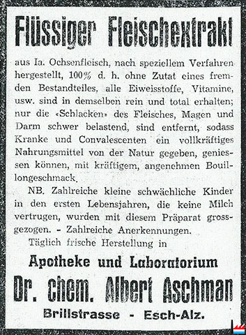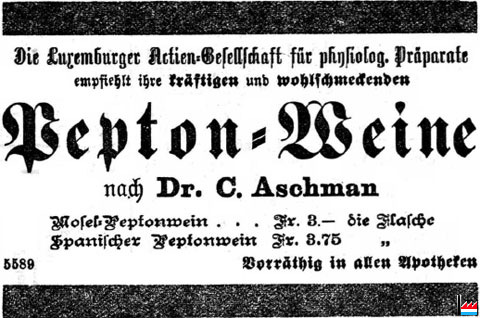 | Juin - juillet 1927 | Kraftwein mit Fleischextrakt nach in Deutschland, Frankreich, Belgien und Luxemburg patentierten Verfahren hergestellt. - Höchste Heilwirkung. - Apotheke und Laboratorium A. ASCHMAN, 2303 (Tageblatt 29 juin, 5 et 12 juillet 1927) |