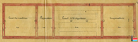 Fabrique de peptone de viande Aschman Camille, Schieren: Local des machines - Préparation - Local de 30 digesteurs - Evaporation (Document: ANLux J90 / 45)