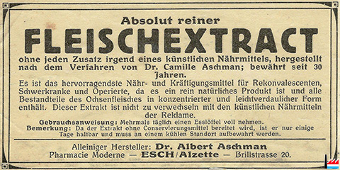 | Février 1926 | Flüssiger, konzentrierter Fleischextrakt aus prima Ochsenfleisch hergestellt nach Verfahren von Dr. Camille Aschman, bewährt seit 30 Jahren. Günstige Gutachten von Universitätsautorität. 1. Ranges. Bei allen schweren Krankheitskrisen als das beste Nähr- u. Kräftigungsmittel indiziert. Die Flasche portofrei: 15,75 Franken. 335 (Tageblatt: 8 et 13 février 1926) |