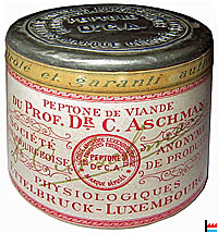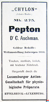 Prof. Dr. C. Aschman's Fleisch-Pepton trocken, sterilisirt, löslich, mit höchster Nährkraft, präpariert durch die Luxemburger Actien-Gesellschaft für physiologische Präparate, ETTELBRUCK-LUXEMBURG. Goldene Medaille, Weltausstellung Antwerpen, 1894. |