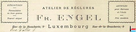 | 5.1928 | ![]() Atelier de reliure Fr. Engel, Luxembourg, Registres - formulaires en tous genres, travail soigné, articles pour Bureaux et l'école, prix modérés |
