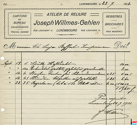 ![]() Atelier de reliure Willmes-Gehlen Joseph, Luxembourg, 19 rue Louvigny - facture de 1922 à M. Luja-Beffort, imprimeur, Luxembourg (Collection industrie.lu) |
