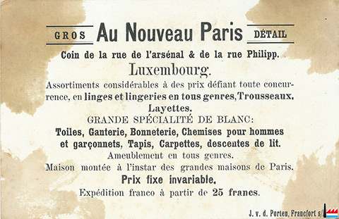 Au Nouveau Paris - Image publicitaire en chromolithographie (8,5 x 13 cm) (Collection Charles-Louis Aschman, Luxembourg)