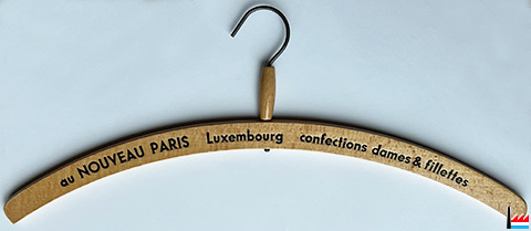 Au Nouveau Paris, Luxembourg - confections dammes & fillettes - Cintre publicitaire en bois (Collection: industrie.lu)