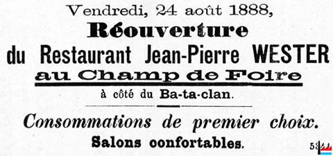 | 24.8.1888 | ![]() Réouverture du Restaurant Jean-Pierre WESTER au Champ de Foire à côté du Ba-ta-clan. Consommations de premier choix. Salons confortables (LIL: 23.8.1888) |
