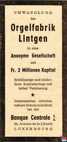 | 3.1953 | ![]() UMWANDLUNG der Orgelfabrik Lintgen in eine Anonyme Gesellschaft mit Fr. 2 Millionen Kapital Erstklassige und risikofreie Kapitalanlage mit hoher Verzinsung Interessenten erhalten nähere Details mündlich bei der Banque Centrale S.A. 26, Avenue de la Liberté LUXEMBOURG (LW: 7.3.1953) |