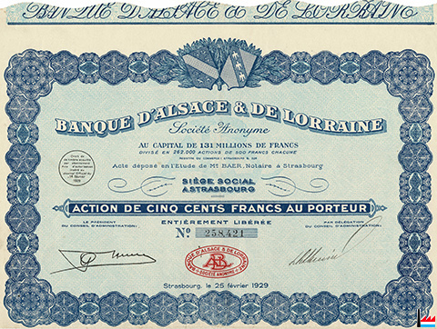 Action de la Banque d'Alsace et de Lorraine, siège social à Strasbourg - 1929 (Collection: industrie.lu)