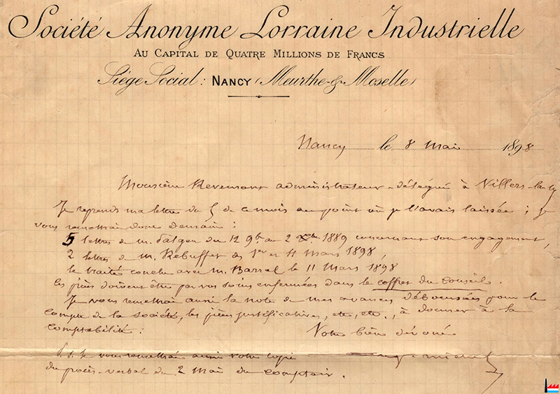 Lettre du 20.4.1898 de F. Barral, ingénieur chimiste à l'Usine de Pompey à M. Michel, président du Conseil d'administration de l'Usine de Pompey (Collection: industrie.lu)