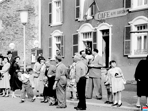 ![]() Café Bloes - Eck Poststrooss - Keelebunn Bloes - Villa Bofferding, riets d'Brauerei Bofferding, Bascharage (Photo: 8.11.1955 Roger Ehleringer) |
