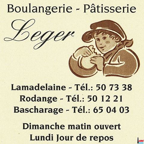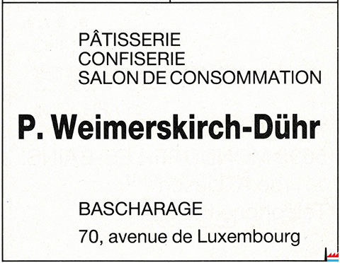 | 105 | <=1995: Pâtisserie Leger, Bascharage Boulangerie - Pâtisserie Leger, Bascharage (wou genee?) - 2002 (Collection: industrie.lu) <=2001: Boutique Le Chevalier, Bascharage, 105 avenue de Luxembourg <=2001: Vita Sport Promotion, Bascharage, 105 avenue de Luxembourg |