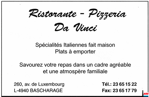 | 260 | ![]() Restaurante - Pizzeria Da Vinci, Bascharage, 260 avenue de Luxembourg - 2006 (Collection: industrie.lu) <=2001, 2006: Restaurant - Pizzeria Da Vinci, Bascharage, 260 avenue de Luxembourg |