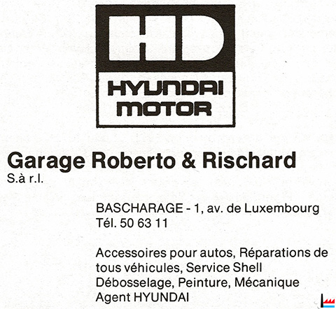 | 1 | ![]() 1 avenue de Luxembourg, Bascharage (Photo: 19.3.2000 jmo) Royal Auto, Bascharage, 1 avenue de Luxembourg (Photo: 26.10.2024 jmo) <=1963: Garage Rischard, Bascharage, Shell - Station 24.10.1970, 1976: Garage AUTO-SELECT, Bascharage - Biff, propr. Raemdonck - Theis, tél: 509473 22.5.1979: Garage Roberto Antonio et Rischard Ferdy, Bascharage, 1 avenue de Luxembourg ![]() Garage Roberto et Rischard , Bascharage, 1 avenue de Luxembourg - Hyundai Motor - 1979 (Collection: industrie.lu) (<=2.1980) Station Fina (<=2.1980: Hyundai Pony) <=2001: Auto-Marché op der Biff, Bascharage, 1 avenue de Luxembourg <=2023: Royal Auto, Bascharage, 1 avenue de Luxembourg ![]() 1-9.7.1972: Gymkhana - Geschicklichkeitsfahren in Niederkerschen - Gymkhana-Geschicklichkeitsrennen, in der Wiese von Henri Meyers, gelegen auf Bascharage-Biff, gegenüber (neben?) der Werkstätte Mieszala (LW: 3.7.1972) |