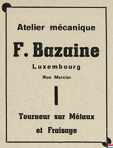 | 1936 | Atelier mécanique Bazaine F., rue Mercier, Luxembourg-gare Tourneur sur métaux et fraisage |