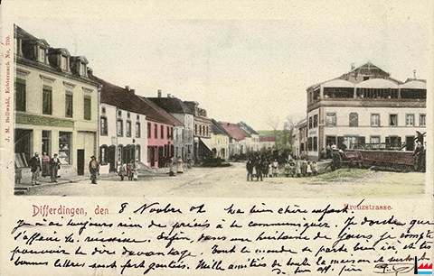 Café A. Warnant-Zeimet, Esch/Alzette, rue d'Audun (N°?) Frontière - an der Grenze - Deutsch-Other Strasse <= 12.1905 (Carte postale: J.M. Bellwald, Echternach, No 411; Collection: industrie.lu)