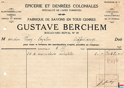 Berchem Gustave 49 boulevard Royal, Luxembourg Fabrique de savons en tous genres Fabrique de cierges et bougies Blanchisserie de cire Epicerie et denrées coloniales, spécialiste de cafés torréfiées |