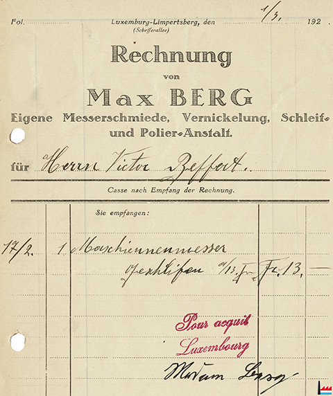 | ? | Fondation - Gründung : Max Berg, Luxembourg-Limpertsberg, Schefferallee, eigene Messerschmiede, Vernickelung, Schleifanstalt, Polieranstalt |