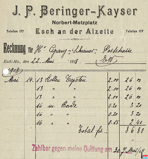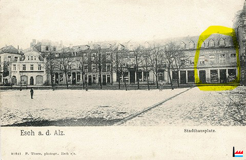 Esch/Alzette - Norbert Metz Platz: Louise Knaff? - Café de Munich Franck-Stoffel - Wagner-van Werveke - Grand Café de la Chapelle - Beringer-Kayser (Linoleum, Glas, Tapeten, Farben), Esch/Alzette, place Norbert-Metz (Carte postale: Papiers en gros P. Houstraas, Luxembourg-Gare, Nr 43; Collection: industrie.lu)