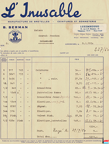 | <6.1950 | L'Insusable - Manufacture de Bretelles - Ceintures et Bonneterie, Bruxelles, Champ du Vert Chasseur, tél: 437264 - Luxembourg, 8 place de Nancy B. Berman |