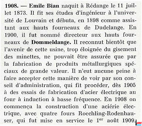 | 1907 | Mise en marche la première épuration complète des gaz de hauts-fourneaux à la Providence à Marchienne-au-Pont : un des 3 hauts-fourneaux utilisait un appareil d'épuration Bian et les 2 autres des laveurs Zschocke (Revue Universelle des Mines - N° 7 - 1942 ; Collection: industrie.lu) |