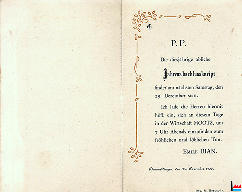 Ich lade die Herren hiermit höfl. ein, sich an diesem Tage in der Wirtschaft MOOTZ, um 7 Uhr Abends einzufinden zum fröhlichen und löblichen Tun.