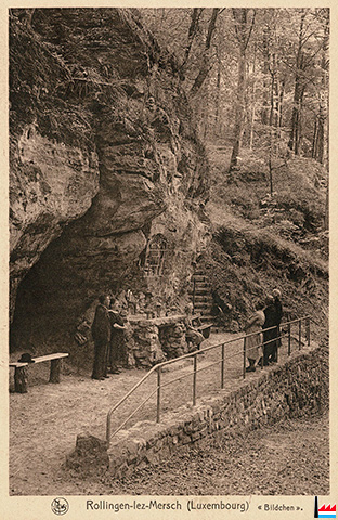 Ein Frühlingsspaziergang durch die Gegend von Rollingen Wir stehen bei der neuerbauten Brücke zwischen Berschbach und Mersch, die Ende des Jahres 1956 für den Verkehr freigegeben wurde. Hier beginnt unser Spaziergang durch den schönen Wald von Rollingen und das nette Dorf. Wir gehen etwa 400 m die Angelsbergerstraße hinauf, nehmen rechts den Feldweg und gelangen zur „Ahlheck“. Hier bleiben wir bei dem vor einigen Jahren erbautem Sommerhaus stehen und genießen die wunderbare Aussicht, über Mersch, Reckingen, Rollingen und den Helpert. Nun biegen wir nach rechts in den Wald und kommen nach ungefähr 150 m an den langgezogenen „Kauschelterlayen“ vorbei. Dort sehen wir viele Schluchten und tiefe Risse in den steilen Felsen, die wie eine Festung anmuten. Sind wir auf den „Kauschelterlayen“, so haben wir einen schönen Ausblick auf den ansteigenden Wald und einen Teil, von Rollingen, das uns viel aus der alten Zeit zu erzählen weiß. Wir gehen ein Stück weiter und kommen an den Gehaansstellerpfad, der zur Jaansmillen führt. Heute steht nur noch eine alte Ruine dort am Bach. Dann erreichen wir den Hénzgrond und finden die Dreibouren. Das Wasser der Dreibouren entspringt im Berg und fließt in einen Weiher. Von hier läuft es über einen Miniaturwasserfall in einen größeren Weiher, um dann im Bach zu enden. Über eine kleine Holzbrücke, die den Bach überquert, gelangen wir zur Jaansmillen. Vor einigen Jahren wurde die Anlage bei den Dreibouren durch den verstorbenen Präsidenten des Verschönerungsvereines neu angelegt, für den dort ein Gedenkstein errichtet wurde. Nun schlagen wir den Pfad ein, der zur Wichtelcherslay emporsteigt. Hier können wir mittelst einer eisernen Stiege in die Höhle hinaufklettern. Nach einer alten Sage sollen dort die Wichtelcher gehaust haben. Weiter kommen wir zur „Muttergotteslay“, auch „Bildchen“ genannt, das vielen im Land bekannt ist. Im Kriege war das „Bildchen“ den Nazis ein Dorn im Auge. Jegliche Prozessionen wurden verboten. In der in den Felsen gehauenen Nische befindet sich eine Statue der Schmerzhaften Mutter. Das „Bildchen“ ist ein viel besuchter Wallfahrtsort. Vom Bildchen aus folgen wir einem schönen Pfad bis zur Lourdesgrotte. Diese wurde nach dem Kriege von den Einwohnern von Rollingen dis Dank für die Befreiung vom Naziterror errichtet. Dann steigen wir den Pfad zur „Burglay“ empor, wo früher die Burg immer abgebrannt wurde. Man hat eine wunderbare Fernsicht über die ganze Gegend: Über Lintgen, Gosseldingen, Rollingen, Mersch, Reckingen und sogar bis nach Limpertsberg. Bei besonders schönem Wetter sehen wir auch noch den Turm der Kirche von Arlon. Gehen wir den Weg hinunter, gelangen wir auf die Belle-Vue und hinunter ins Dorf. Wir kommen an der schönen Dorfkirche vorbei, die 1850 im gotischen Stil erbaut wurde. Bei einem Brande, der in der Kirche ausbrach, wurde der ganze Altar vernichtet. Wir wandern die Straße weiter hinauf und gelangen so wieder an unseren Ausgangspunkt zurück. (LW: 10.4.1959) |
