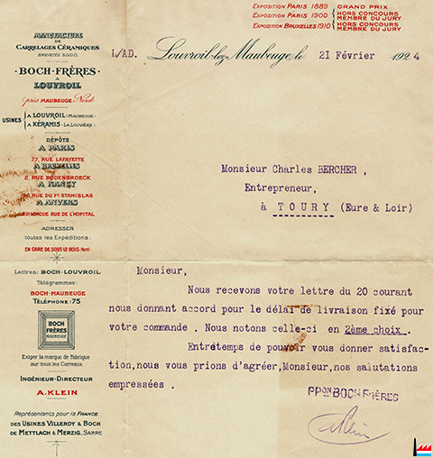 Manufacture de Carrelages Céramiques Boch Frères, Louvroil près Maubeuge (Extrait d'une facture du 21.2.1924; Collection: industrie.lu)