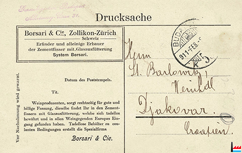 | <=1902 | ![]() Borsari & Comp, Zollikon - Zürich (Collection: industrie.lu) Erfinder, Erbauer & Alleinige Patentinhaber der Cement-Fässer & - Cisternen mit Glasausfütterung |
