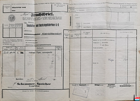 | 15.4.1930 | ![]() Frachtbrief für 1 Wagen (Halle N° 27007) roher Ton, unverpackt, von Jakob Schommer, Speicher an Tonplatten- und Dachziegelfabriken A.G., Kleinblittersdorf (Sammlung: Wilhelm Schommer) |