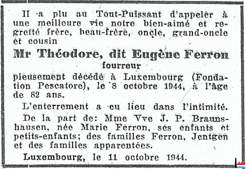 1944 - Décès à Luxembourg, à la Fondation Pescatore, le 8 octobre 1944, à l’âge de 82 ans de Monsieur Théodore, dit Eugène Ferron, fourreur.