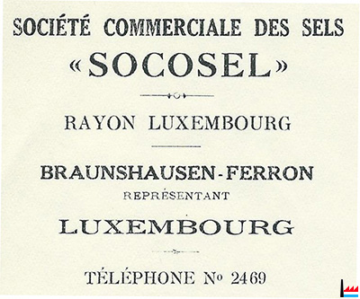 | 193x | ![]() SOCOSEL - SOciété COmmerciale des SELs, Luxembourg Rayon Luxembourg Braunshausen-Ferron réprésentant Luxembourg Tél: 2469 |