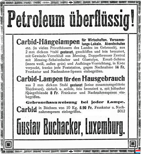 | 9.1913 | Brevet d'invention N°10361 - 24. September 1913 Carbid-Grubenlampe mit selbsttätigem Zünder G. Buchacker in Kayl |