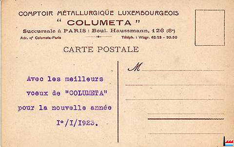 | 1923 | ![]() Direction générale de l'ARBED, Terres-Rouges, COLUMETA - 1926 (Collection industrie.lu) |
