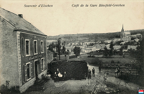 ![]() Café de la Gare - Café Binsfeld-Grechen, Eischen - vers 1907 (Carte postale: J.A. Weber, phot., Ettelbruck 2057; Collection: industrie.lu) |