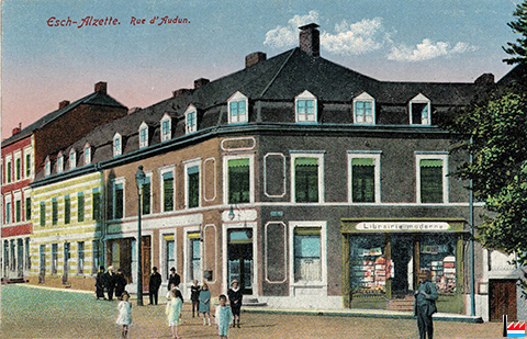 Esch/Alzette: coin rue d'Audun et avenue de la Gare: Librairie moderne (Carte postale: E.A. Schaack, Luxembourg-Gare; Collection: industrie.lu)