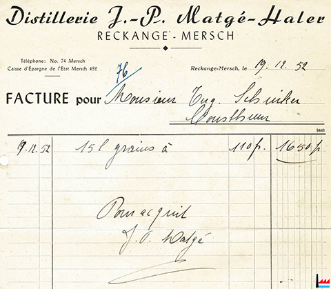 | 6.1946 | ![]() Moulins & Distillerie Nic. Kneip, Kautenbach - facture à M. Schinker, Consthum - pour 10 l Branntwein (Collection: industrie.lu) |