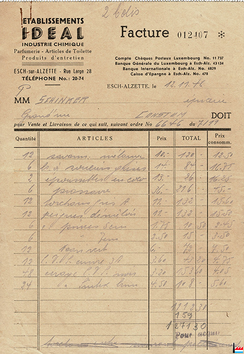 | 11.1946 | ![]() Etablissements IDEAL - Industrie chimique - facture du 12.11.1946 à Schinker, Consthum (Collection: industrie.lu) |