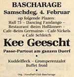 | 4.2.1984 | ![]() BASCHARAGE - Samschdeg, 4. Februar 1984 op folgende Plazen : Hall 75 - Dancing Fandango - Restaurant «Beim Hollänner» - Café «Beim Germaine» - Café Nickels a Café Schleich Kee Geescht Passe-Partout am ganzen Duerf Kuddelfleck - Gromperenzalot - Buffet froid Org.: Handball-Club Bascharage (Revue: 2.2.1984) |