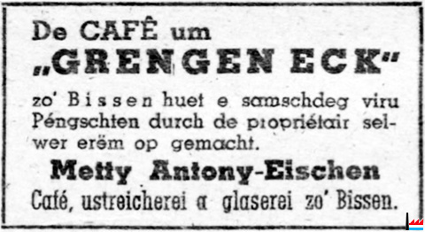 | 5.1945 | ![]() Réouverture: Café Grengen Eck, Bissen (D'Unio'n: 19.5.1945) Propriétaire: Metty Antony - Eischen - de gringe Mett Café, Ustreicherei a Glaserei |