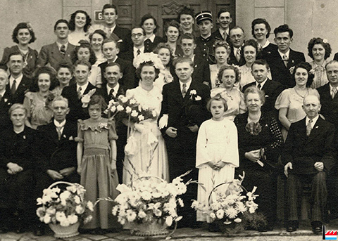 Hochzäit Michel Reuter - Juliette Kugener, virum Café de la Gare zu Hoen - ~1946 (Collection: industrie.lu)