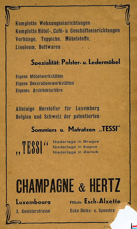 | 1934 | Manufacture de meubles Champagne & Hertz, Hollerich / Luxembourg Bureaux et salles d'exposition: 3 rue Génistre Ateliers et magasins: 99 rue de Hollerich |