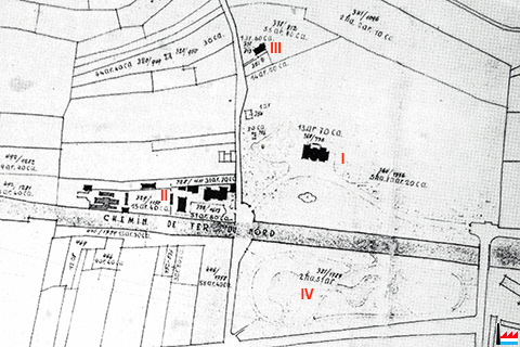 A la gauche de la rue Cyprien Merjai: les annexes (e.a. Serre) - à la droite de la rue Cyprien Merjai: le Château de Beggen - 1954 © Origine Administration du Cadastre et de la Topographie Luxembourg (ACT) - Extrait de la carte topographique à l'échelle 1: 25.000 édition 1954 - Autorisation de publication du 20.10.2010.»
