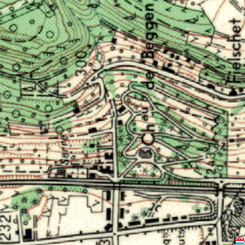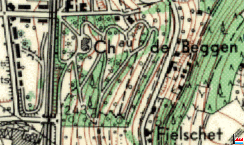 | 1954 | ![]() Au-dessus de la rue Cyprien Merjai: les annexes (e.a. Serre) - en bas de la rue Cyprien Merjai: le Château de Beggen - 1954 © Origine Administration du Cadastre et de la Topographie Luxembourg (ACT) - Extrait de la carte topographique à l'échelle 1: 25.000 édition 1954 - Autorisation de publication du 20.10.2010.» |