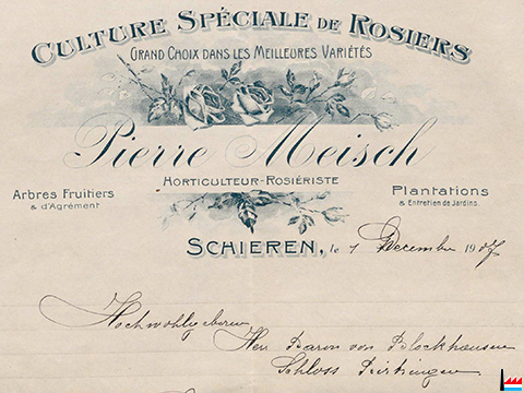 Pierre Meisch, Schieren, horticuleur-rosériste - culture spéciale de rosiers - Grand choix dans les meilleures variétés - an Baron von Blockhausen - Schloss Birtringen (Extrait d'une lettre de 1.12.1907; collection ANLux)